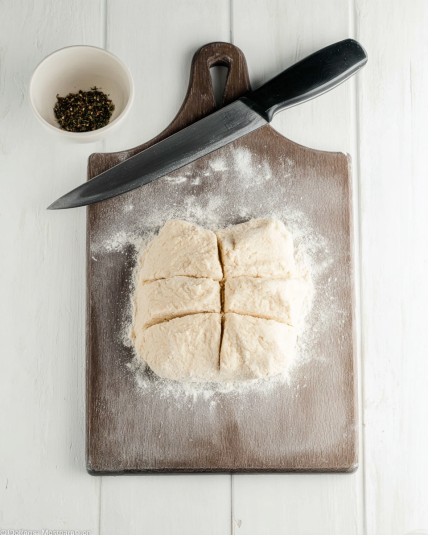 Divide, flatten gently, and press a small hole in the center. This keeps it from puffing unevenly.