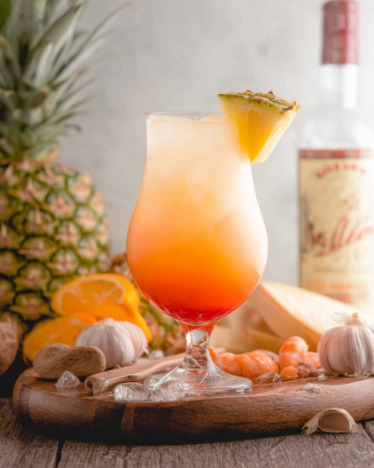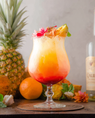That bright pineapple sweetness, the orange citrus, the soft coconut finish, and that gorgeous splash of grenadine sinking to the bottom like a little sunset—it felt like vacation in a glass.