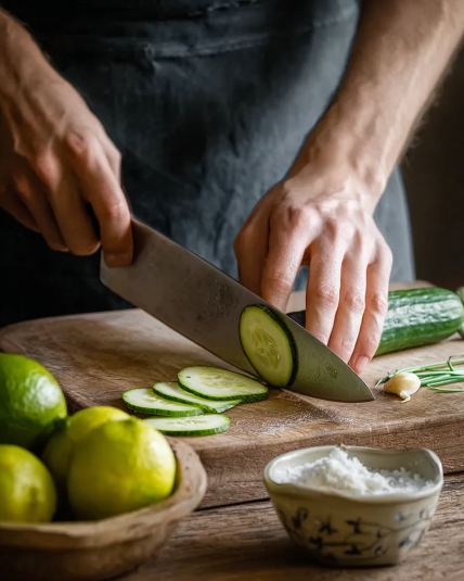 I sliced a cucumber and the smell hit immediately—clean, green, cooling. I tore a few basil leaves, rubbed them between my fingers, and suddenly the kitchen smelled like summer.