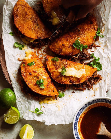 This usually happens if your pan isn’t hot enough or if the tortillas are too wet from the consomé. Dip lightly — don’t soak — and make sure your skillet is properly heated before the tortilla touches it. The cheese also helps with crispiness because it creates that golden seal along the fold.