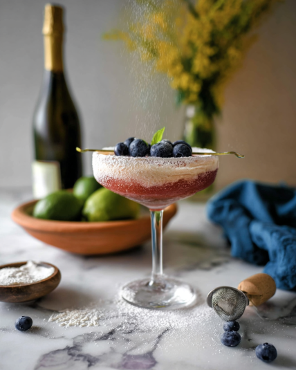 There’s something incredibly comforting about drinks that are simple but feel playful. A mimosa is familiar, safe, reliable — and then you add blueberry puree and suddenly it’s bold, flirtatious, a little mischievous. I love that. I love that a drink can shift the mood of a morning.