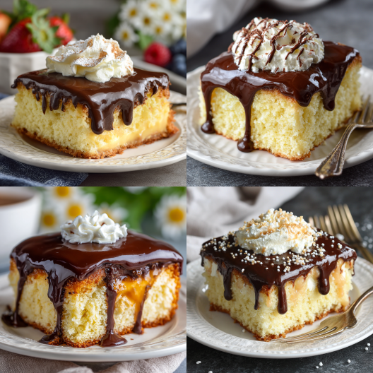 There’s something so wonderfully retro about this cake — like it came straight from a family gathering in the ‘90s when someone’s aunt showed up with a casserole dish covered in foil and said, “Just wait till you taste this.” It’s not fancy. It’s not trying to impress anyone. It’s soft yellow cake, creamy vanilla pudding, and glossy chocolate on top. That’s it. And somehow, that’s everything.