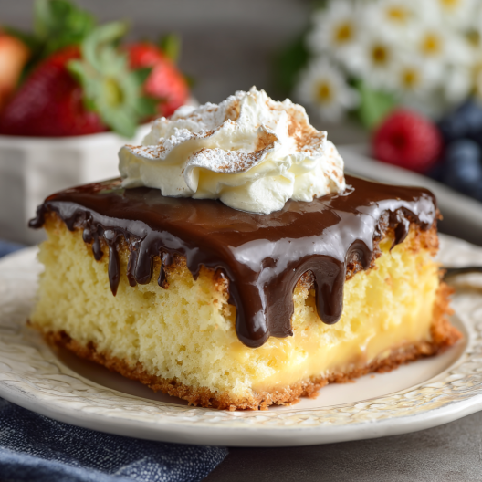 There’s something so wonderfully retro about this cake — like it came straight from a family gathering in the ‘90s when someone’s aunt showed up with a casserole dish covered in foil and said, “Just wait till you taste this.” It’s not fancy. It’s not trying to impress anyone. It’s soft yellow cake, creamy vanilla pudding, and glossy chocolate on top. That’s it. And somehow, that’s everything.