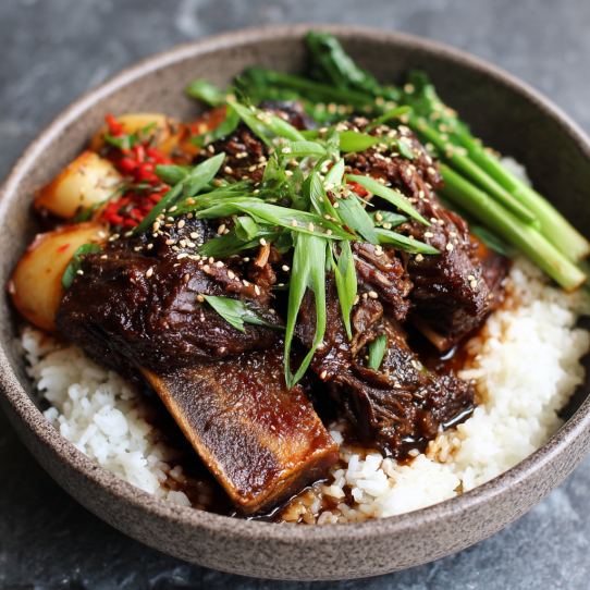This dish is Korean-inspired — called “Galbi Jjim” — and it’s one of those meals that feels like a hug in a bowl. Tender beef that just falls apart with your chopsticks, vegetables that soak up all that glossy sauce, and a broth so rich and slightly sweet it clings to the rice when you scoop it up. It’s not fancy. It’s not quick. But it’s one of those recipes that makes you slow down — not just while cooking, but while eating, too.