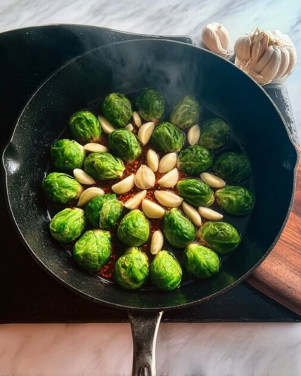 Add the garlic after the sprouts have already begun to brown. Garlic cooks fast, especially in hot cast iron, and burns before the sprouts finish. By adding it halfway through, you let it soften, caramelize, and perfume the dish without turning bitter.