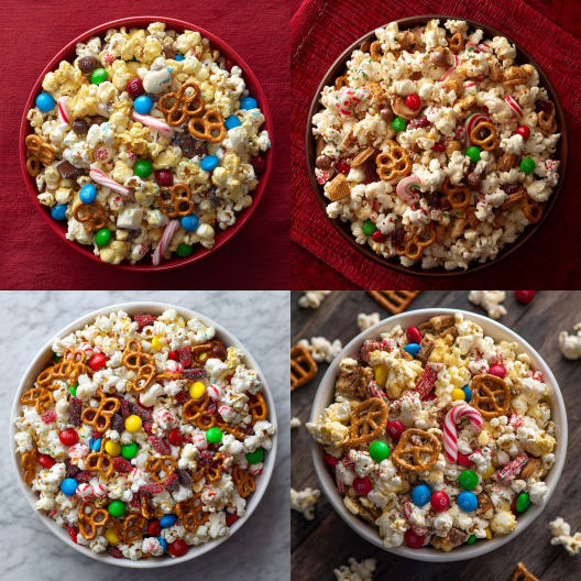 In a big bowl, toss in the popcorn, pretzel pieces, M&M’s, and candy canes if you’re using them. It’ll already look cheerful and loud, like Christmas confetti.