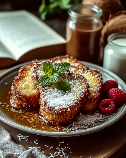 Use thick bread. Thin slices collapse under the custard and coconut coating. Brioche holds everything beautifully.