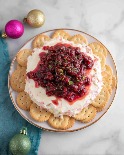 Yes—this dip is actually better when made in advance. The cranberry mixture needs at least an hour to chill so the flavors can blend and the cranberries soften slightly. Overnight chilling creates the perfect balance of sweet, spicy, and tangy. Store the cranberry mixture separately and spoon it over the cream cheese right before serving so the presentation stays bright and fresh.