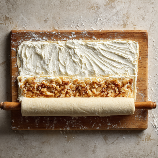 Flatten the bread slices gently with a rolling pin. Spread a thin layer of cream cheese, then spoon a little apple mixture down one edge. Roll snugly, but don’t overstuff.