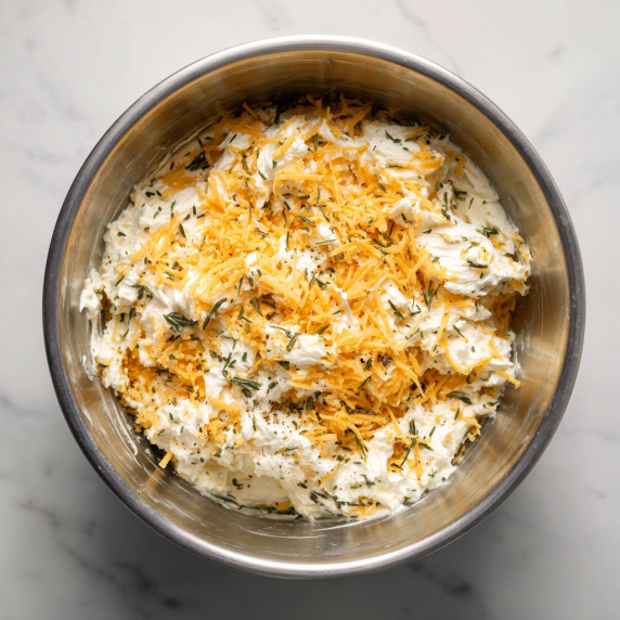 In a bowl, combine cream cheese, shredded cheddar, herbs, and seasoning. It won’t look perfect, and that’s okay.