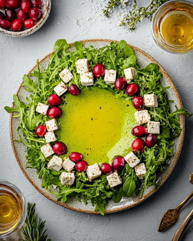 The key to a standout easy Christmas salad wreath with pomegranate is balance. Too much dressing can weigh it down, so start light — you can always add more. Also, dry your greens well so the dressing clings instead of sliding off.