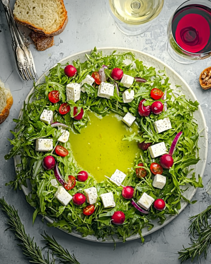 The key to a standout easy Christmas salad wreath with pomegranate is balance. Too much dressing can weigh it down, so start light — you can always add more. Also, dry your greens well so the dressing clings instead of sliding off.