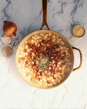 If you’re adding bacon, don’t rush it. Let it crisp slowly so it renders enough fat to flavor the whole dish.