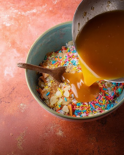 Pour in the cereal and work quickly but gently. You want every colorful piece coated without crushing the crunch. Press the mixture into a lined pan using slightly damp hands—trust me, that trick saves you from sticky chaos. Let it set for 20–25 minutes, then slice into bars.