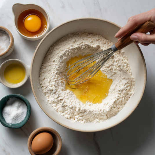 Start by mixing the dry ingredients—nothing fancy, just a gentle stir to keep things light. In another bowl, whisk the eggs, milk, melted butter, and honey until glossy and smooth.