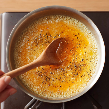 Meanwhile, melt butter in a small pan, add honey, pepper, soy sauce, and chili flakes. Let it bubble gently until glossy.