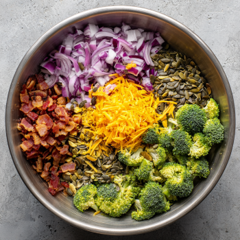 In a big bowl, combine broccoli, bacon, cheese, onion, and seeds. Already looks good, right?