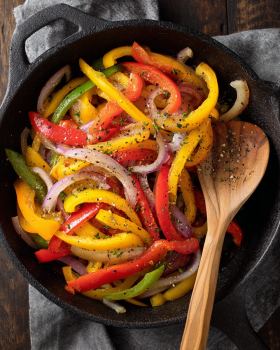Start by heating a pan and adding a little oil. Toss in your onions and peppers first.