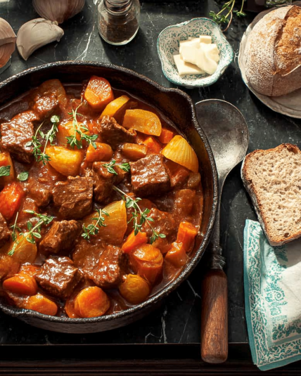 After about an hour, toss in the potatoes and carrots. Simmer until everything is tender and the sauce hugs the meat like it means it.