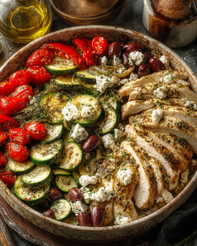 What makes it special isn’t complexity. It’s balance. Salty olives, sweet tomatoes, mellow zucchini, and herby chicken all sharing the same space, soaking up flavor together.