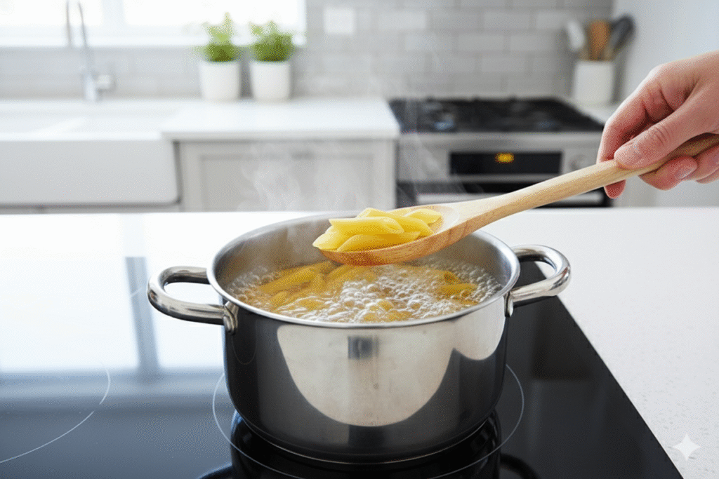 Salt your water like you mean it — it should taste like the sea. Cook the pasta until just al dente, then drain. Keep a little pasta water on the side in case you want to loosen it later. - Make the base.