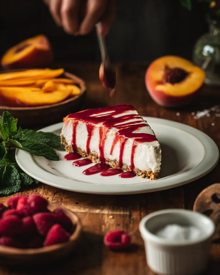 I had ripe peaches on the counter, the kind that perfume the whole room just by existing. A handful of raspberries sat in the fridge, slightly wrinkled, begging not to be forgotten. And suddenly, cheesecake felt inevitable.