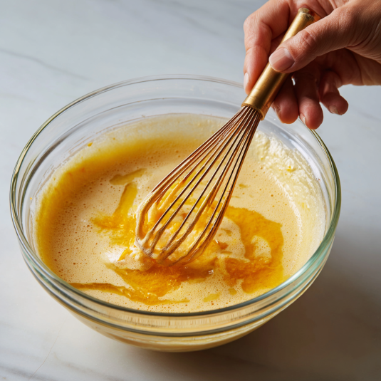 In another bowl, whisk honey with eggs until glossy. Add melted butter, orange zest, juice, and milk.