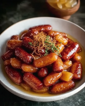 Start by adding your lil smokies to a pan or slow cooker. No need to overthink it—just spread them out evenly. Add the pineapple chunks right on top. Let some of that juice stay—it adds flavor. Sprinkle the brown sugar over everything. Don’t mix yet. Just let it sit for a second. It starts melting as it warms up, and that’s exactly what you want. Now pour in the barbecue sauce and add the mustard and garlic powder. Stir gently until everything is coated. You’ll notice the sauce looks a bit thin at first—don’t worry. Let it cook on medium heat (or low in a crockpot). Slowly, the sauce thickens into that sticky, glossy coating. Stir occasionally, just enough to keep things moving but not break anything apart. After about 20–25 minutes, the sauce becomes rich and caramelized. That’s your moment. Serve warm. Try not to eat half of them straight from the pan… it’s harder than it sounds.