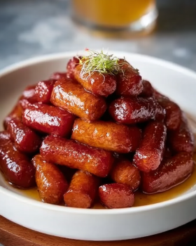 Start by adding your lil smokies to a pan or slow cooker. No need to overthink it—just spread them out evenly. Add the pineapple chunks right on top. Let some of that juice stay—it adds flavor. Sprinkle the brown sugar over everything. Don’t mix yet. Just let it sit for a second. It starts melting as it warms up, and that’s exactly what you want. Now pour in the barbecue sauce and add the mustard and garlic powder. Stir gently until everything is coated. You’ll notice the sauce looks a bit thin at first—don’t worry. Let it cook on medium heat (or low in a crockpot). Slowly, the sauce thickens into that sticky, glossy coating. Stir occasionally, just enough to keep things moving but not break anything apart. After about 20–25 minutes, the sauce becomes rich and caramelized. That’s your moment. Serve warm. Try not to eat half of them straight from the pan… it’s harder than it sounds.