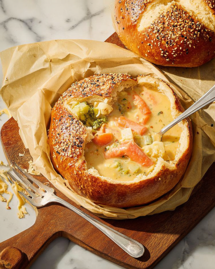 Broccoli cheddar, potato soup, chili, beer cheese soup, tomato bisque, or creamy mushroom soups are absolute winners. Thicker soups hold up best because they sit nicely inside the bowl without soaking in too quickly.