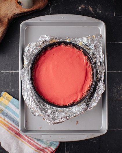 • Start with the crust—graham crumbs, melted butter, sugar. Mix until it feels like wet sand and press firmly into a springform pan.