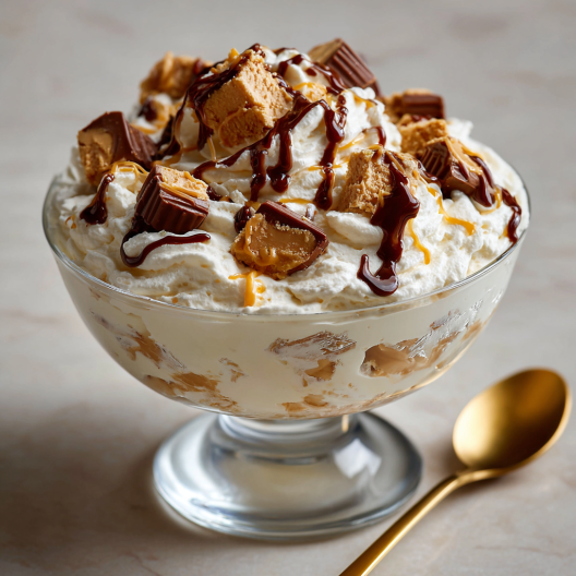 I don’t even know where to start with this one because honestly, it’s one of those desserts that makes you feel like a kid again. I first made it on a lazy Sunday afternoon when I was craving peanut butter and chocolate in the worst way. I had some cream cheese in the fridge, a tub of Cool Whip, and a handful of Reese’s Miniatures — nothing fancy, just stuff I already had. I wasn’t expecting much… but then I took the first bite, and wow. That first bite hits you with sweet, creamy peanut butter, soft, cloud-like fluff, and those little chocolate-peanut butter pockets hidden throughout.