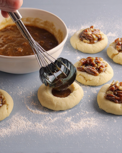 Absolutely. These cookies freeze beautifully because the pecan filling is dense and stable. Freeze them flat on a tray, then transfer to a freezer bag. When thawing, let them sit uncovered for about 20 minutes so the tops don’t become sticky.