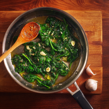 Start by warming a pan with a little olive oil. Add garlic and spinach, letting it wilt down slowly.