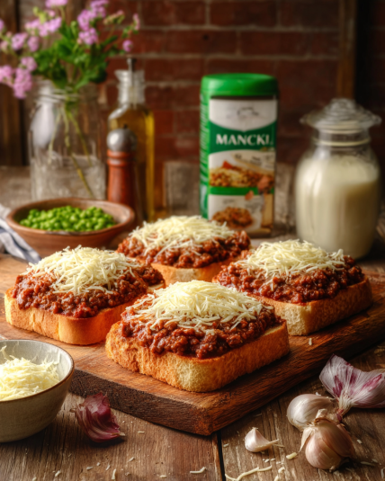 Finally, assemble everything—toast, filling, cheese—and bake briefly again. The result is a perfect balance of crispy, saucy, and cheesy textures.