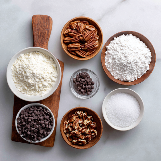 - Stir in the flour and salt until just combined. Then fold in the pecans, toffee bits, and chocolate chips.