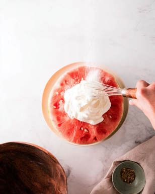 Spread a light layer of whipped cream all over the watermelon. Not too thick—we’re decorating, not hiding evidence.