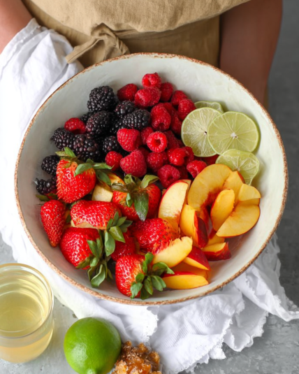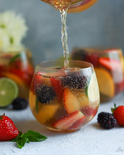 Now toss in all that gorgeous fruit. Let it sink and float however it wants; the beauty is in the randomness. Chill the whole thing for at least an hour. When you’re ready to serve, top it with sparkling water so it keeps that light, crisp edge, then fill glasses with plenty of ice and a little extra fruit from the bottom.